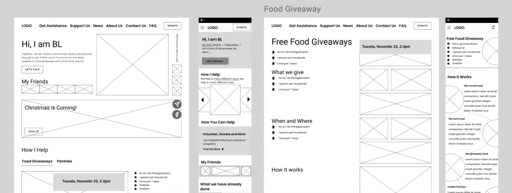 The idea for BL’s Little Free Pantries website stemmed from the need to address communication gaps and streamline processes for different types of users. Through user segment analysis, we learned that our community consists of a diverse age range, from young adults to seniors. We identified three key user groups: individuals seeking food assistance, volunteers, and sponsors. Each group had distinct needs and challenges, requiring a tailored approach to design and content.