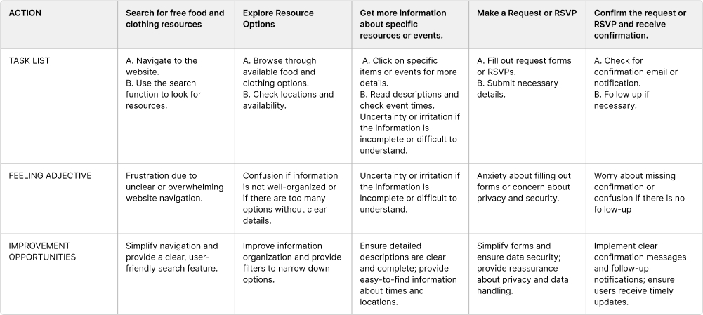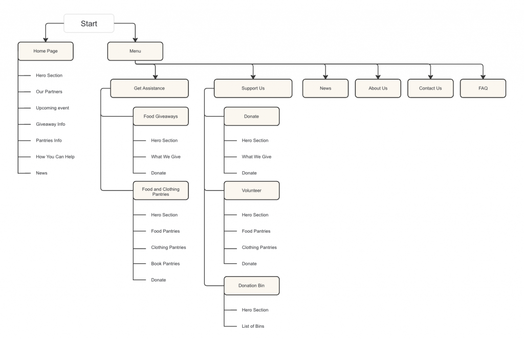 We gathered all the insights from our user research and organized them visually to identify key elements for the website design. After a brainstorming session, I mapped out the user journey for each group—food recipients, volunteers, and sponsors. I broke down the journey into three stages: before accessing food, during food distribution, and after the distribution. After discussing the business strategy and long-term goals with the leadership team, we focused on simplifying the process into two main areas: providing easy access to information before food distribution and offering clear volunteer and sponsorship opportunities after engagement.